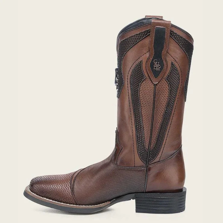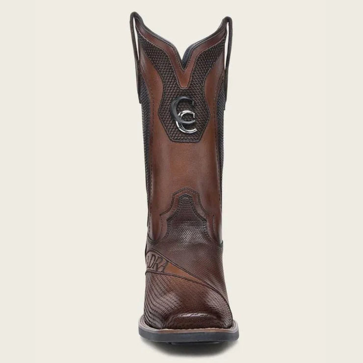This men’s honey brown leather boot features detailed embroidery and laser-etched accents across a square toe silhouette, showcasing bold texture and premium Cuadra craftsmanship. Made from genuine crust leather with durable construction, it delivers standout Western-inspired style and refined character ideal for everyday wear or special occasions.