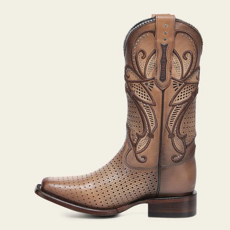 This women’s almond leather boot features detailed laser-etched and embroidered accents for striking texture and refined Western-inspired style. Handcrafted with premium Cuadra craftsmanship and genuine bovine leather, it delivers bold character and durable comfort for standout everyday wear or elevated outfits.